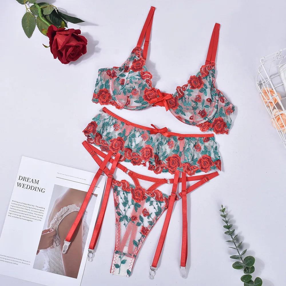3-częściowy zestaw bielizny koronkowej w róże
