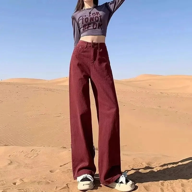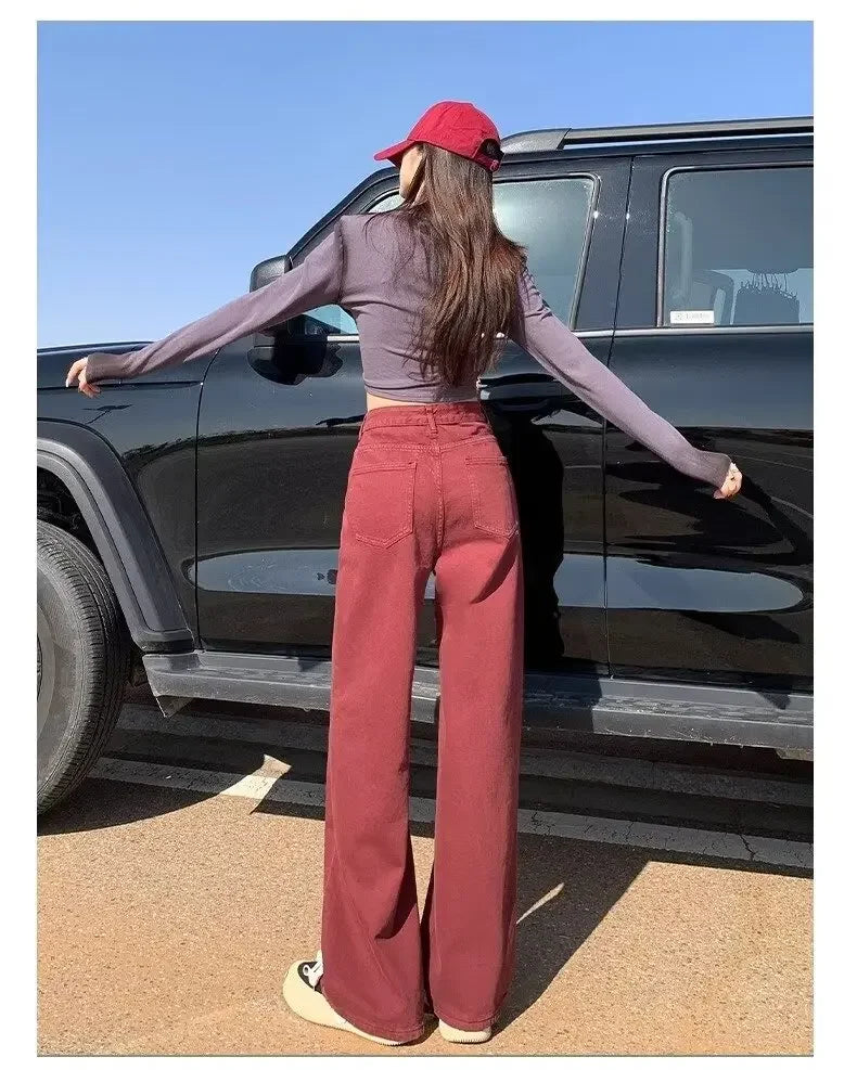 Bordowe jeansy damskie z prostą nogawka