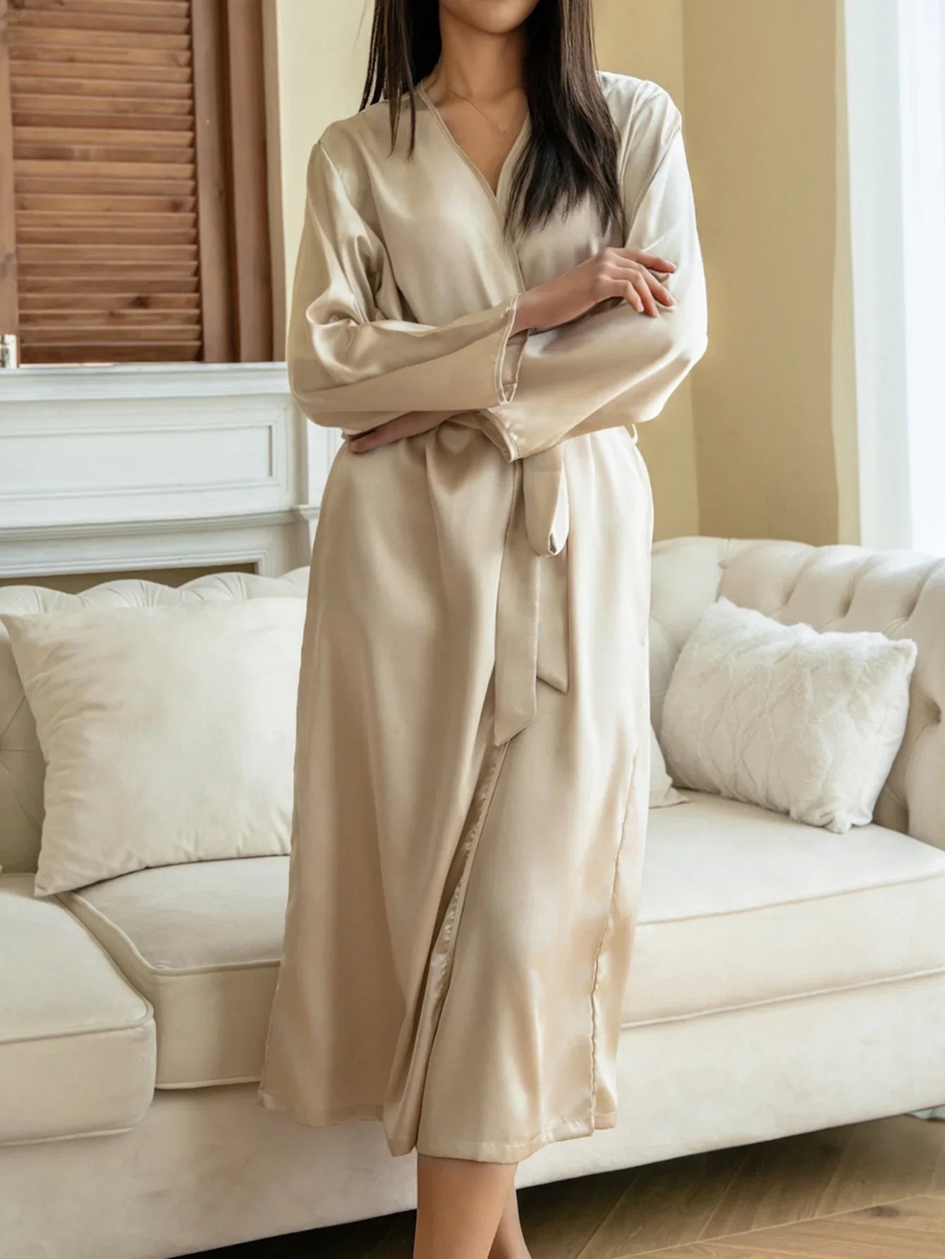 Satynowy szlafrok damski z długim rękawem