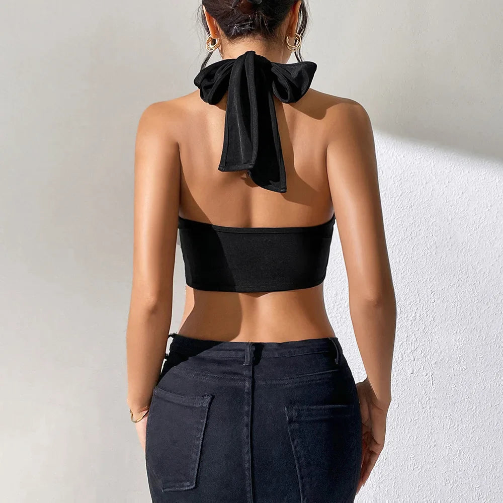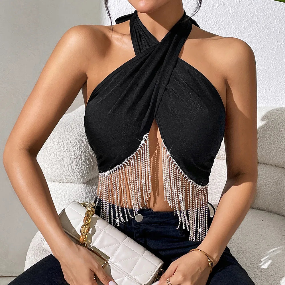 Wiązany na szyi top damski z łańcuszkami