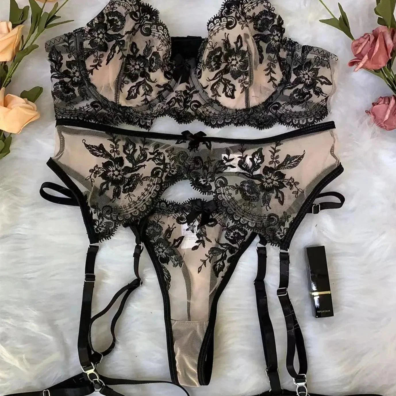 - Komplet bielizny: biustonosz, pas z podwiązkami, majtki stringi